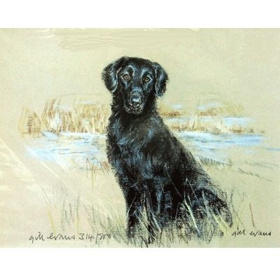 Flat Coat in the Bullrushes By Mick Cawston 12x9.5