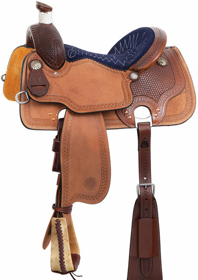 We offer saddles from trusted brands like Australian Outrider, Circle Y, Colorado Saddlery, King Series, Reinsman, Royal King, Silver Royal, Tough-1, Tucker Trail Saddles, and more. Check out one of our best-selling saddles, the Tough1 Medina Roughout Barrel Saddle. It’s a great saddle for everyone no matter your riding level. It features full roughout leather with accents of turquoise buckstitching too!