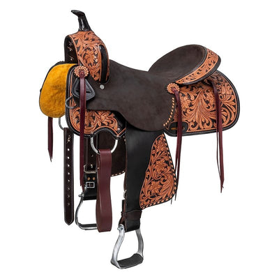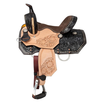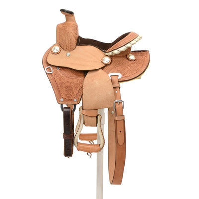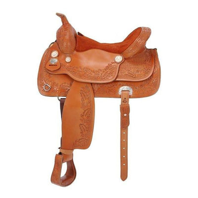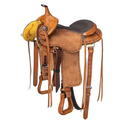 We offer saddles from trusted brands like Australian Outrider, Circle Y, Colorado Saddlery, King Series, Reinsman, Royal King, Silver Royal, Tough-1, Tucker Trail Saddles, and more. Check out one of our best-selling saddles, the Tough1 Medina Roughout Barrel Saddle. It’s a great saddle for everyone no matter your riding level. It features full roughout leather with accents of turquoise buckstitching too!