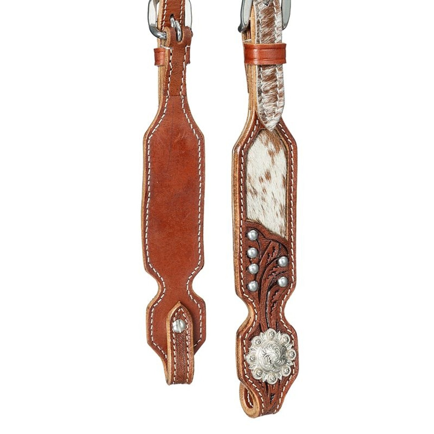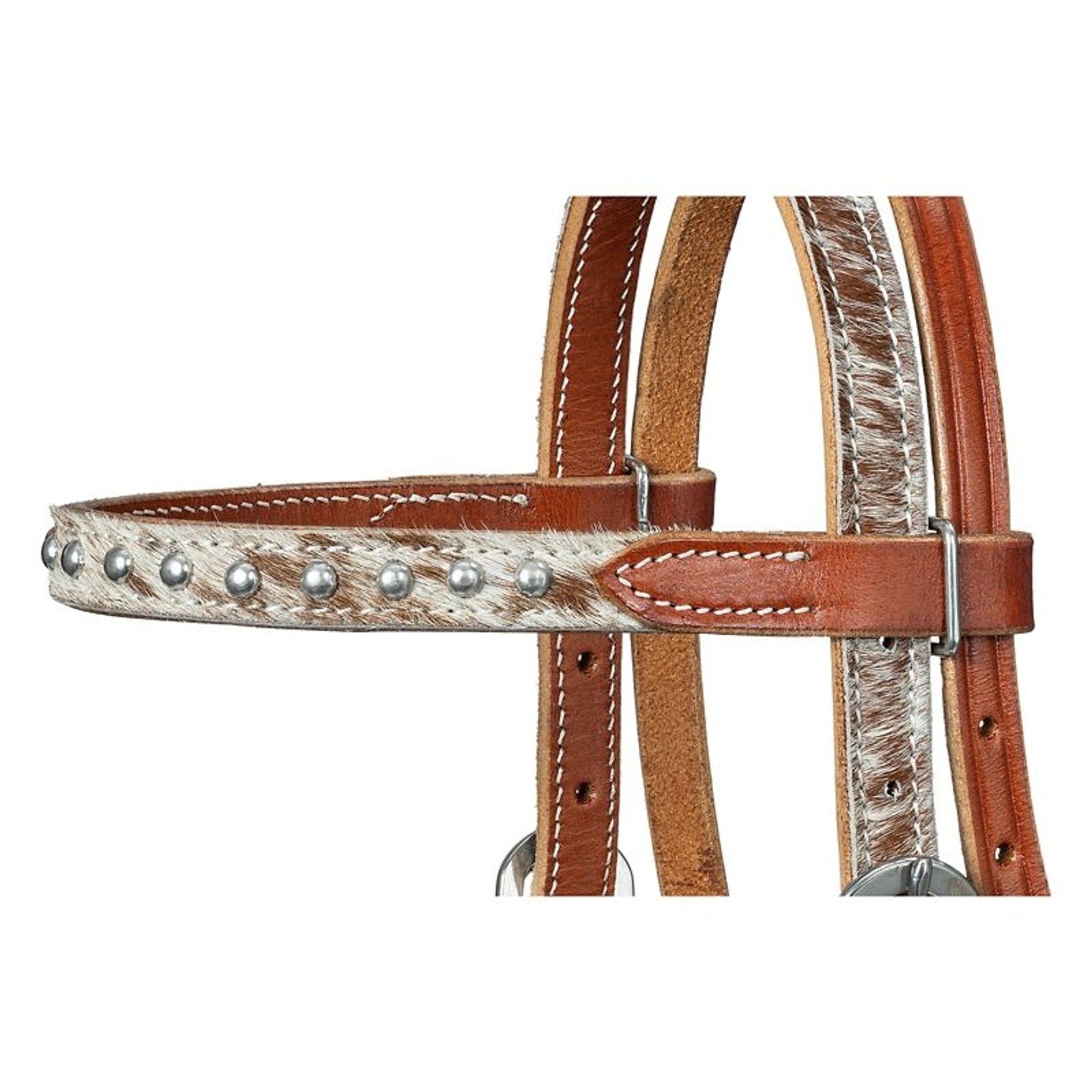 This browband headstall is inspired by the Fort Worth Stockyards for a truly western look. The medium oil leather is almost entirely covered with brown and white cowhide as an homage to the longhorns. Hand tooled screw bit ends with silver dots and berry edge concho accents complete the look.